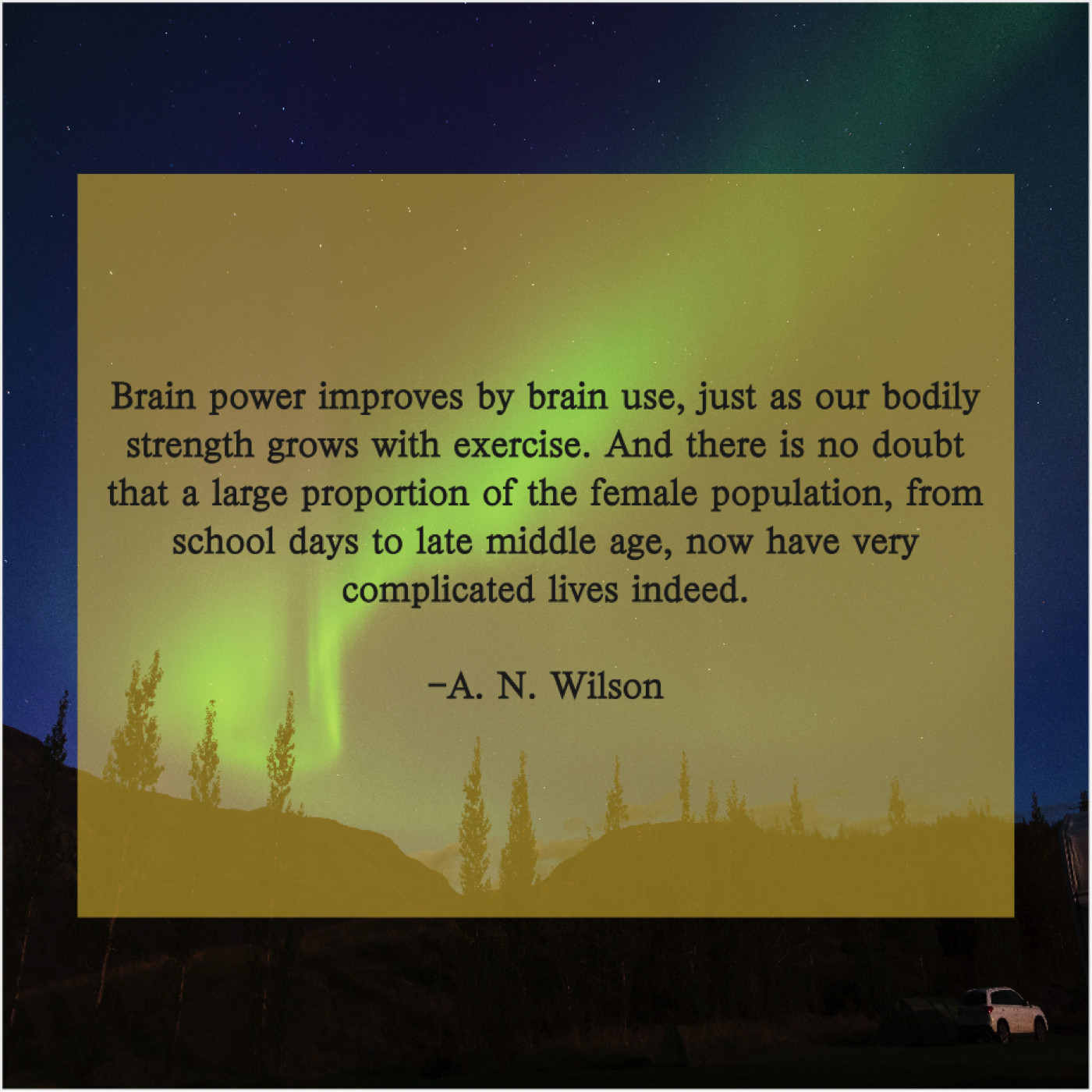 A. N. Wilson A. N. Wilson – Brain power improves by brain… May 5, 2019 admin “Brain power improves by brain use, just as our bodily strength grows with exercise. And there is no doubt that a large proportion of the female population, from school days to late middle age, now have very complicated lives indeed.”-A. N. Wilson