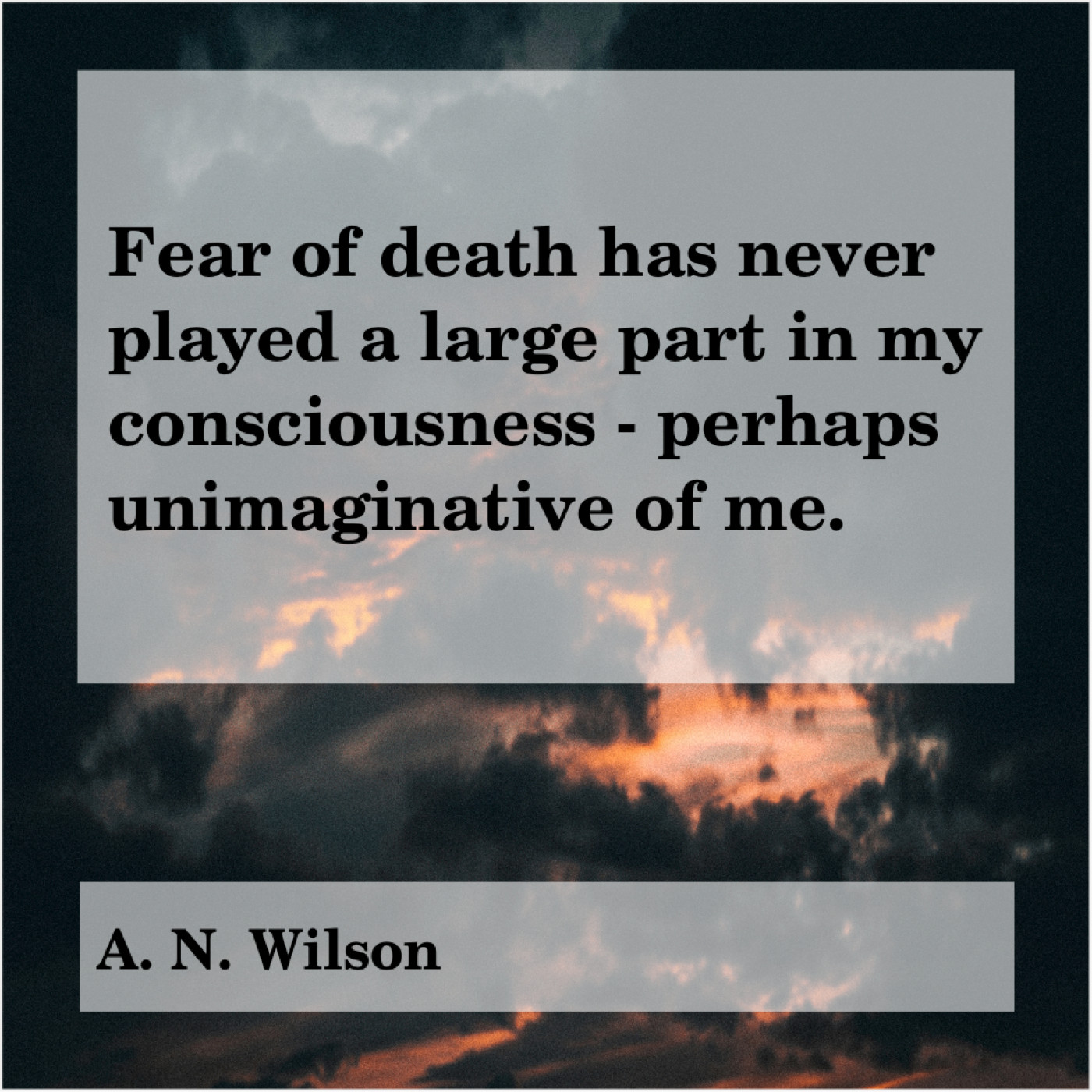 A. N. Wilson A. N. Wilson – Fear of death has never… March 21, 2019 admin “Fear of death has never played a large part in my consciousness – perhaps unimaginative of me.”-A. N. Wilson