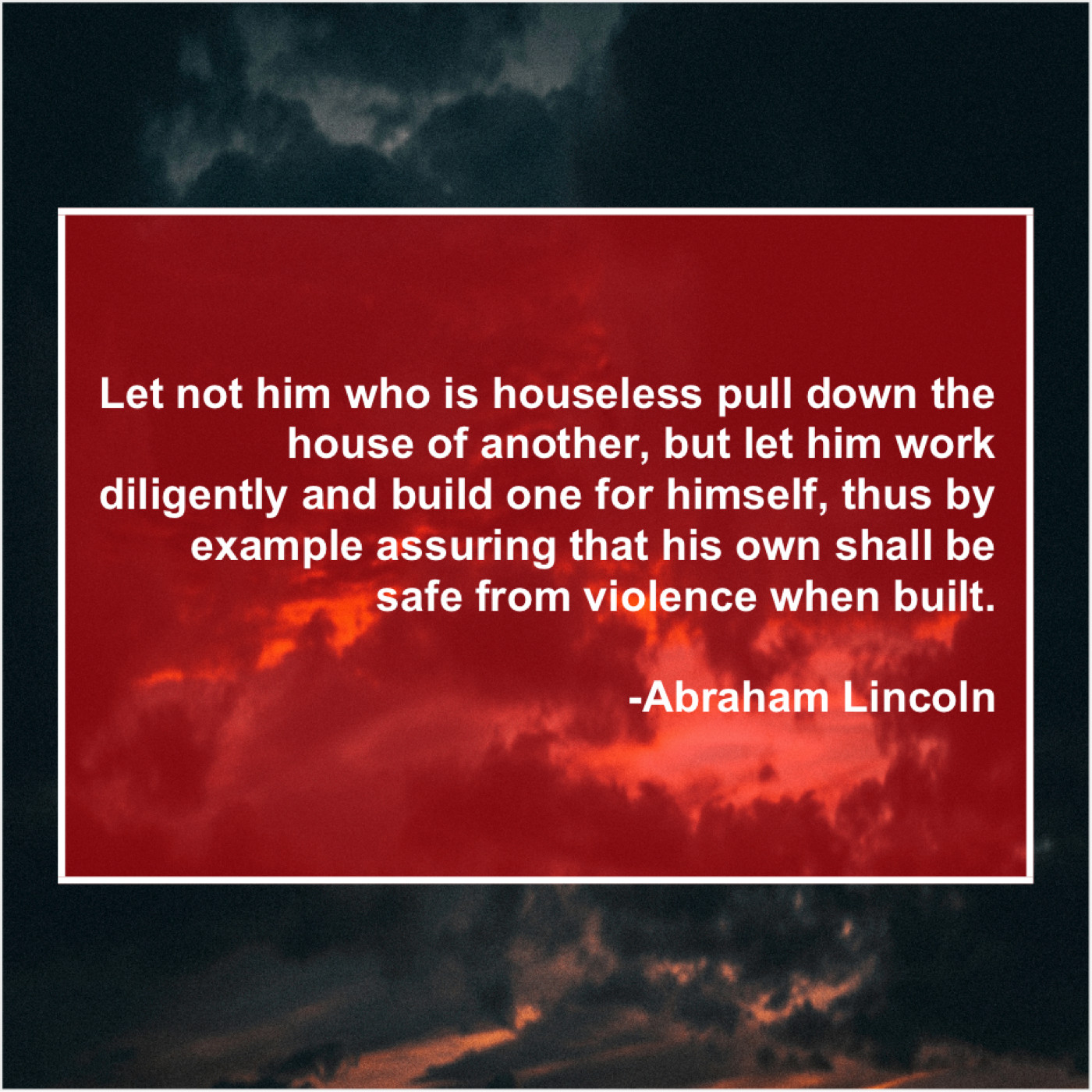 Abraham Lincoln Abraham Lincoln – Let not him who is… July 3, 2019 admin “Let not him who is houseless pull down the house of another, but let him work diligently and build one for himself, thus by example assuring that his own shall be safe from violence when built.”-Abraham Lincoln