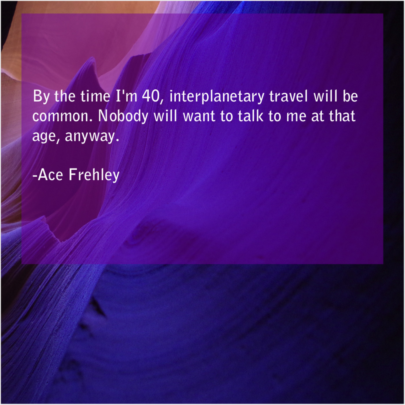 Ace Frehley Ace Frehley – By the time I’m 40… December 22, 2018 admin “By the time I’m 40, interplanetary travel will be common. Nobody will want to talk to me at that age, anyway.”-Ace Frehley