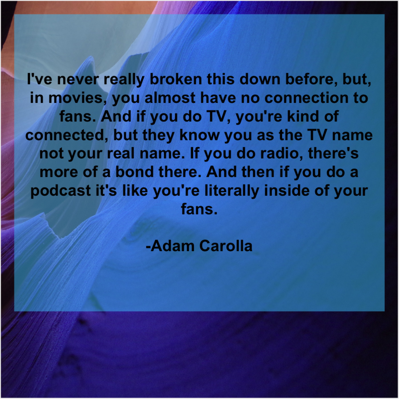 “I’ve never really broken this down before, but, in movies, you almost have no connection to fans. And if you do TV, you’re kind of connected, but they know you as the TV name not your real name. If you do radio, there’s more of a bond there. And then if you do a podcast it’s like you’re literally inside of your fans.”