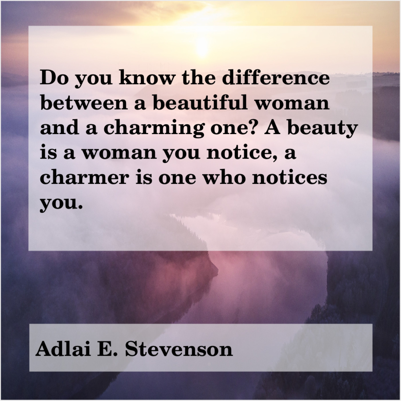 Adlai E. Stevenson Adlai E. Stevenson – Do you know the difference… May 12, 2019 admin “Do you know the difference between a beautiful woman and a charming one? A beauty is a woman you notice, a charmer is one who notices you.”-Adlai E. Stevenson