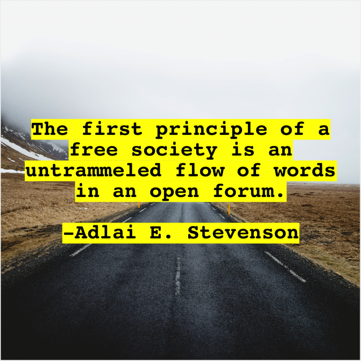 Adlai E. Stevenson Adlai E. Stevenson – The first principle of a… July 11, 2019 admin “The first principle of a free society is an untrammeled flow of words in an open forum.”-Adlai E. Stevenson