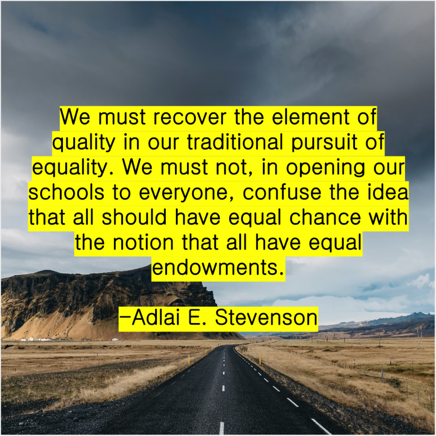 Adlai E. Stevenson Adlai E. Stevenson – We must recover the element… June 10, 2019 admin “We must recover the element of quality in our traditional pursuit of equality. We must not, in opening our schools to everyone, confuse the idea that all should have equal chance with the notion that all have equal endowments.”-Adlai E. Stevenson