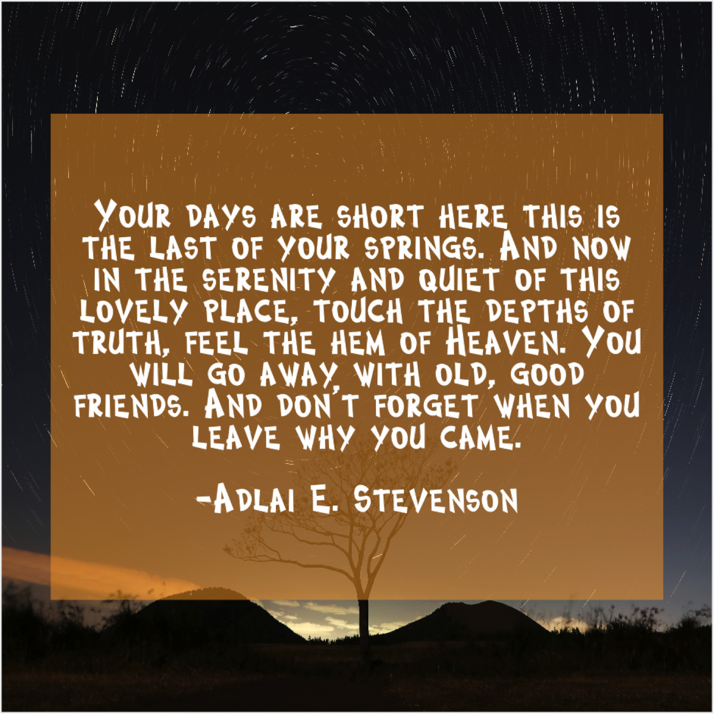 “Your days are short here this is the last of your springs. And now in the serenity and quiet of this lovely place, touch the depths of truth, feel the hem of Heaven. You will go away with old, good friends. And don’t forget when you leave why you came.”