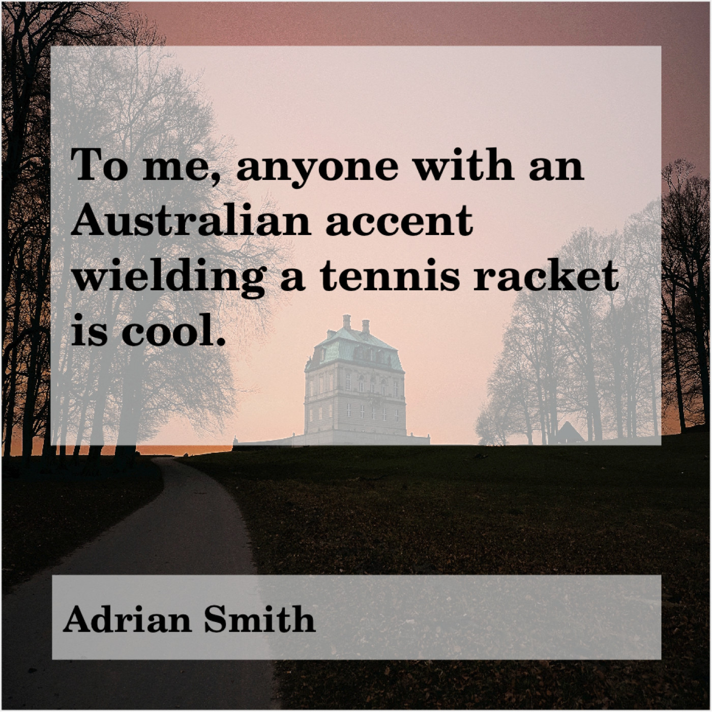 Adrian Smith Adrian Smith – To me, anyone with an… December 1, 2018 admin “To me, anyone with an Australian accent wielding a tennis racket is cool.”-Adrian Smith