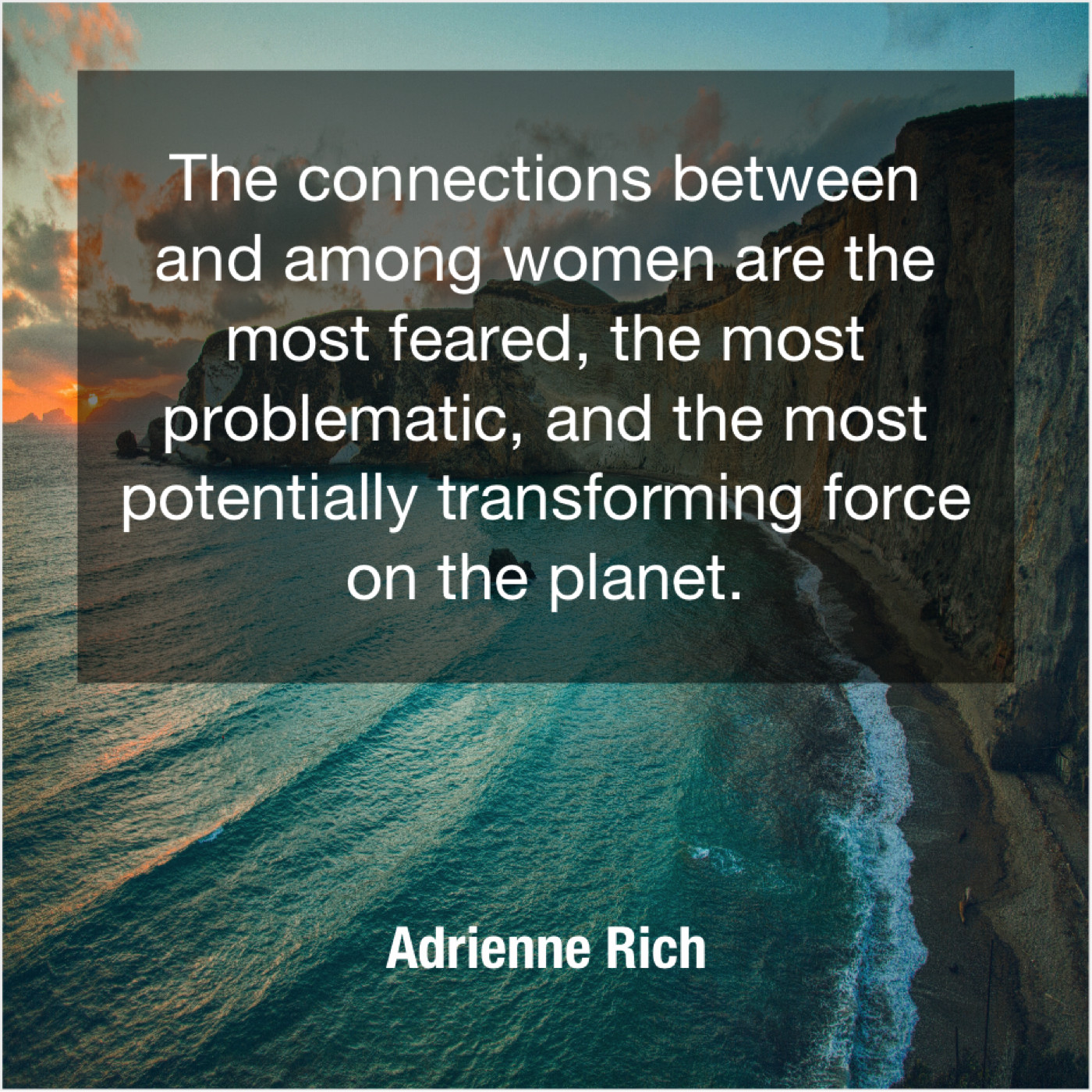 Adrienne Rich Adrienne Rich – The connections between and among… January 18, 2019 admin “The connections between and among women are the most feared, the most problematic, and the most potentially transforming force on the planet.”-Adrienne Rich