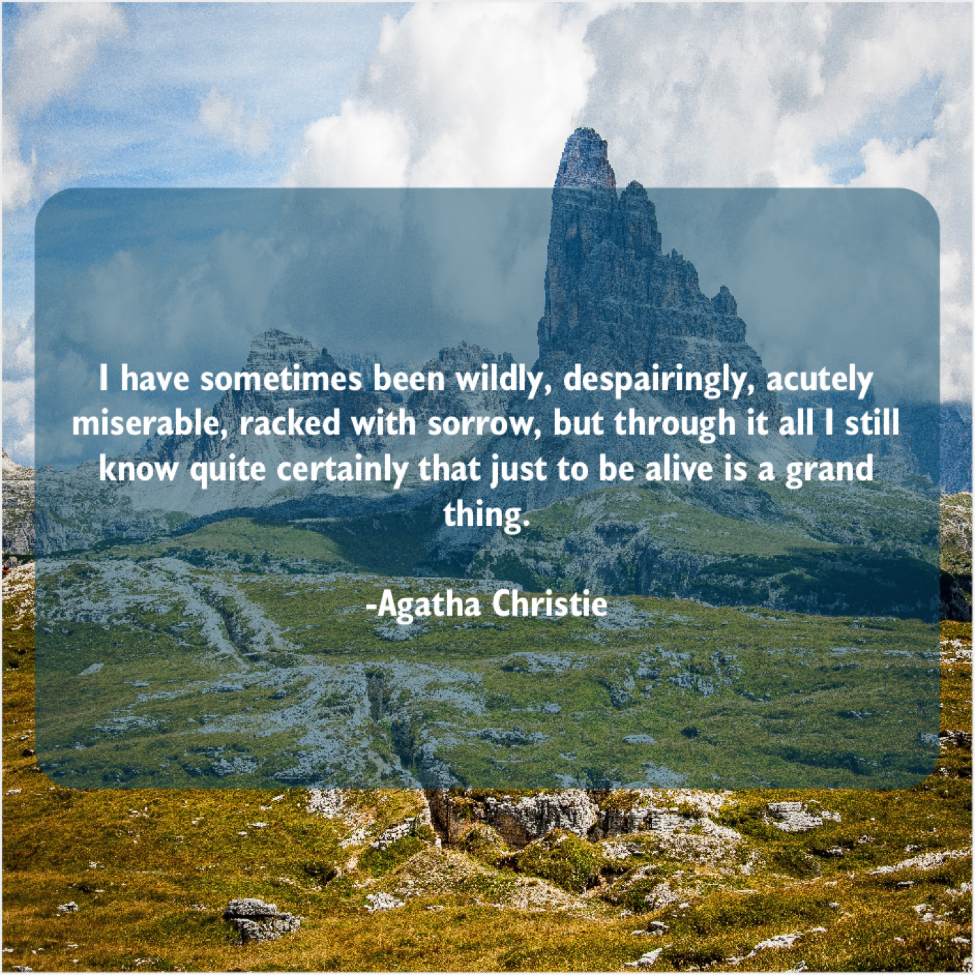 Agatha Christie Agatha Christie – I have sometimes been wildly… May 1, 2019 admin “I have sometimes been wildly, despairingly, acutely miserable, racked with sorrow, but through it all I still know quite certainly that just to be alive is a grand thing.”-Agatha Christie