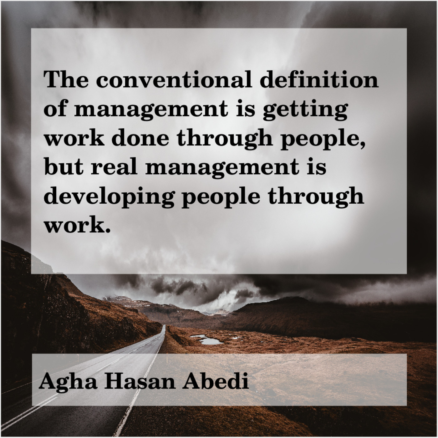 Agha Hasan Abedi Agha Hasan Abedi – The conventional definition of management… February 18, 2019 admin “The conventional definition of management is getting work done through people, but real management is developing people through work.”-Agha Hasan Abedi