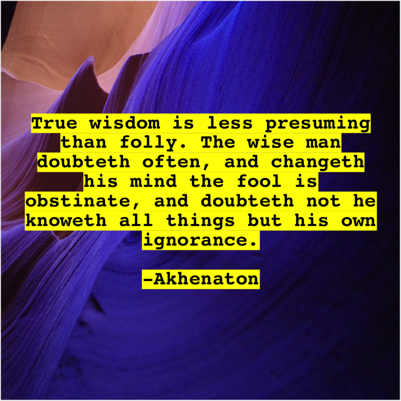 Akhenaton Akhenaton – True wisdom is less presuming… January 28, 2019 admin “True wisdom is less presuming than folly. The wise man doubteth often, and changeth his mind the fool is obstinate, and doubteth not he knoweth all things but his own ignorance.”-Akhenaton