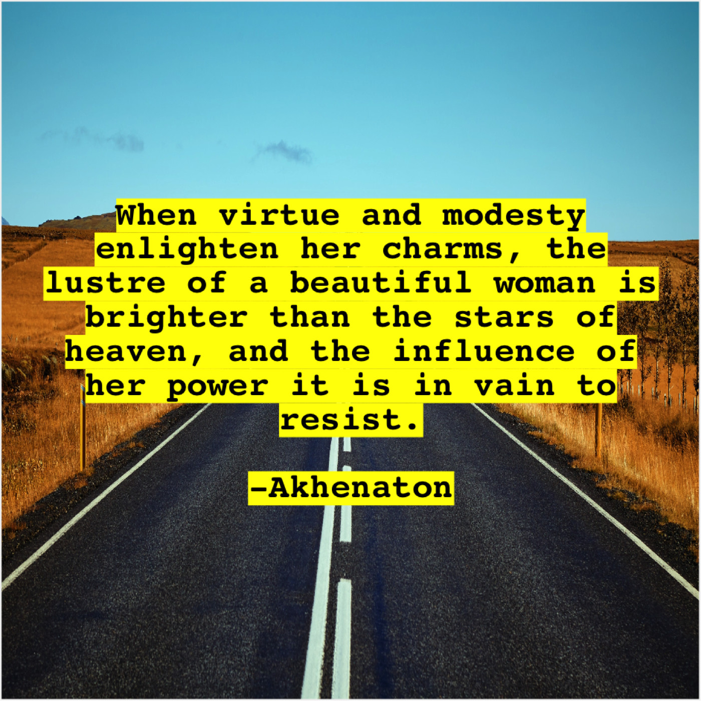 Akhenaton Akhenaton – When virtue and modesty enlighten… April 19, 2019 admin “When virtue and modesty enlighten her charms, the lustre of a beautiful woman is brighter than the stars of heaven, and the influence of her power it is in vain to resist.”-Akhenaton