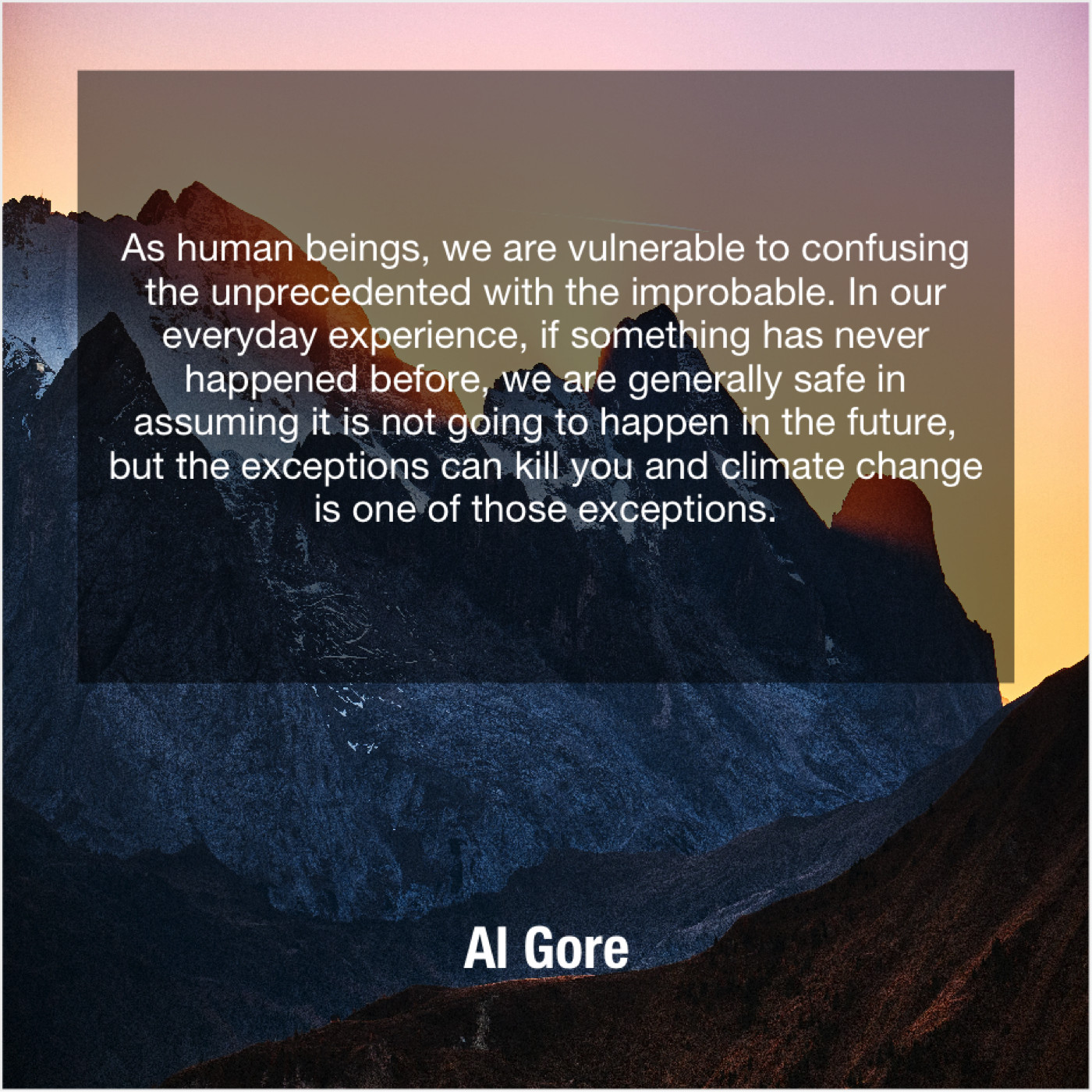 “As human beings, we are vulnerable to confusing the unprecedented with the improbable. In our everyday experience, if something has never happened before, we are generally safe in assuming it is not going to happen in the future, but the exceptions can kill you and climate change is one of those exceptions.”