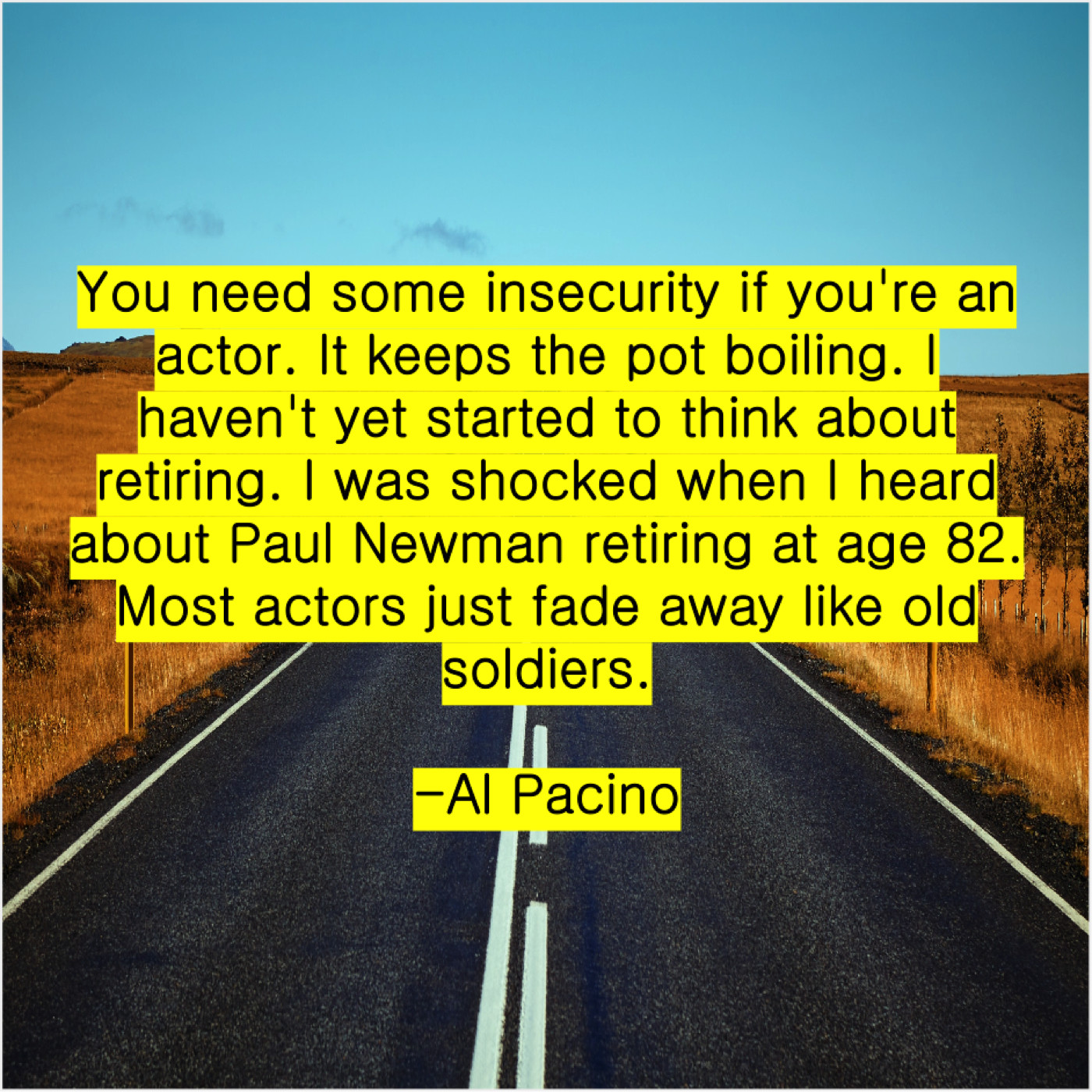 Al Pacino Al Pacino – You need some insecurity if… July 25, 2019 admin “You need some insecurity if you’re an actor. It keeps the pot boiling. I haven’t yet started to think about retiring. I was shocked when I heard about Paul Newman retiring at age 82. Most actors just fade away like old soldiers.”-Al Pacino