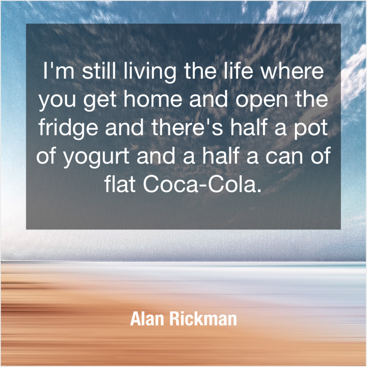 Alan Rickman Alan Rickman – I’m still living the life… December 27, 2018 admin “I’m still living the life where you get home and open the fridge and there’s half a pot of yogurt and a half a can of flat Coca-Cola.”-Alan Rickman