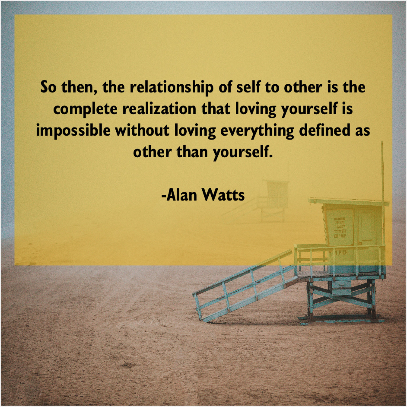 Alan Watts Alan Watts – So then, the relationship of… May 6, 2019 admin “So then, the relationship of self to other is the complete realization that loving yourself is impossible without loving everything defined as other than yourself.”-Alan Watts