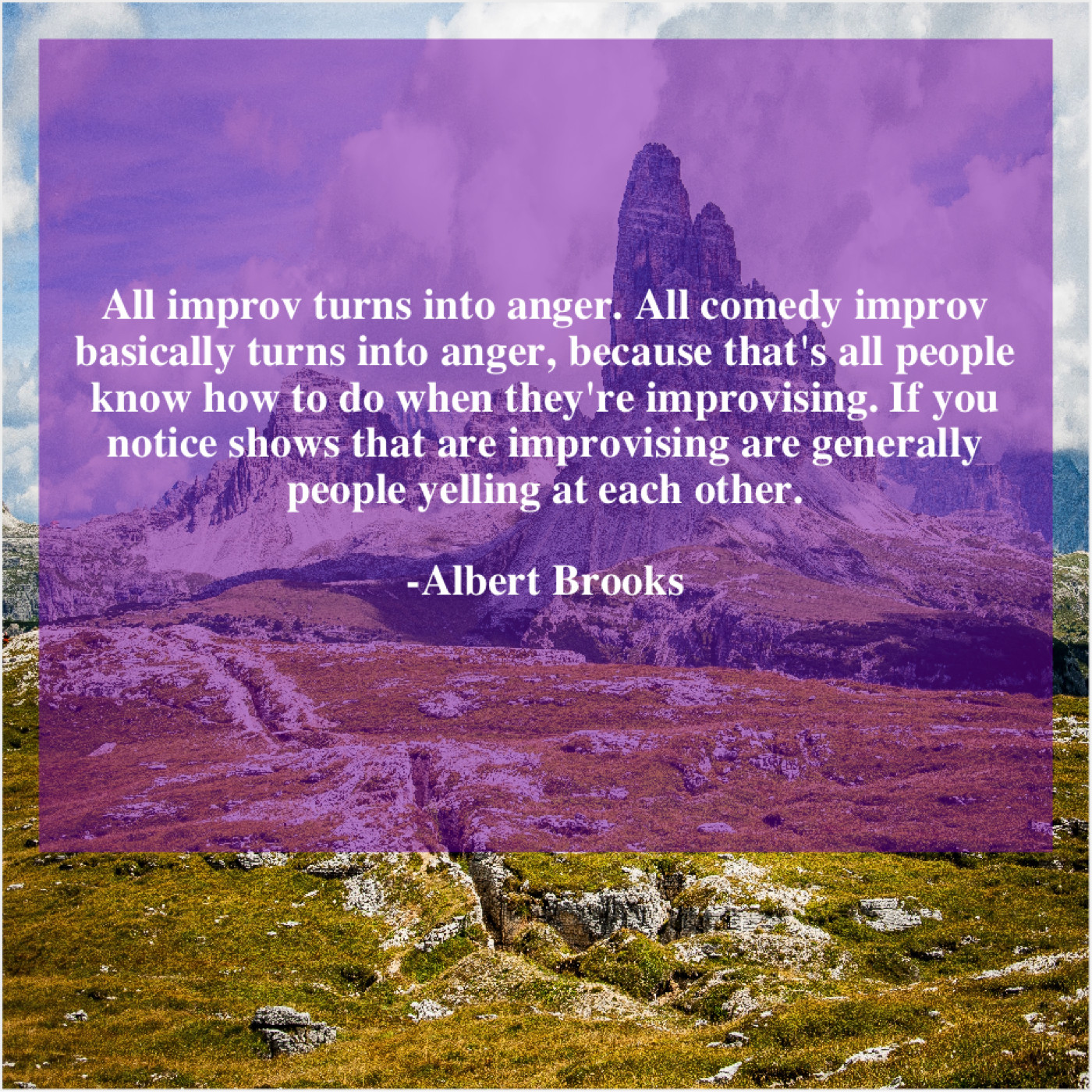 Albert Brooks Albert Brooks – All improv turns into anger… October 16, 2019 admin “All improv turns into anger. All comedy improv basically turns into anger, because that’s all people know how to do when they’re improvising. If you notice shows that are improvising are generally people yelling at each other.”-Albert Brooks