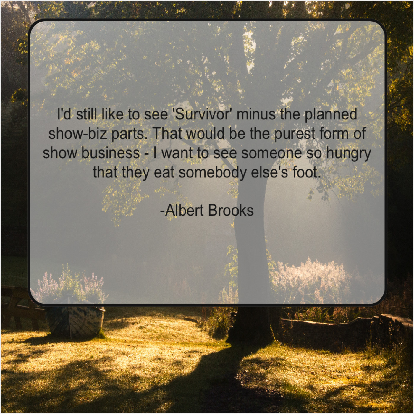 Albert Brooks Albert Brooks – I’d still like to see… January 14, 2019 admin “I’d still like to see ‘Survivor’ minus the planned show-biz parts. That would be the purest form of show business – I want to see someone so hungry that they eat somebody else’s foot.”-Albert Brooks