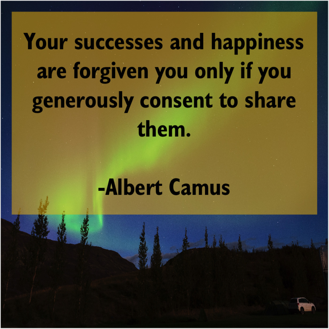Albert Camus Albert Camus – Your successes and happiness are… August 15, 2019 admin “Your successes and happiness are forgiven you only if you generously consent to share them.”-Albert Camus