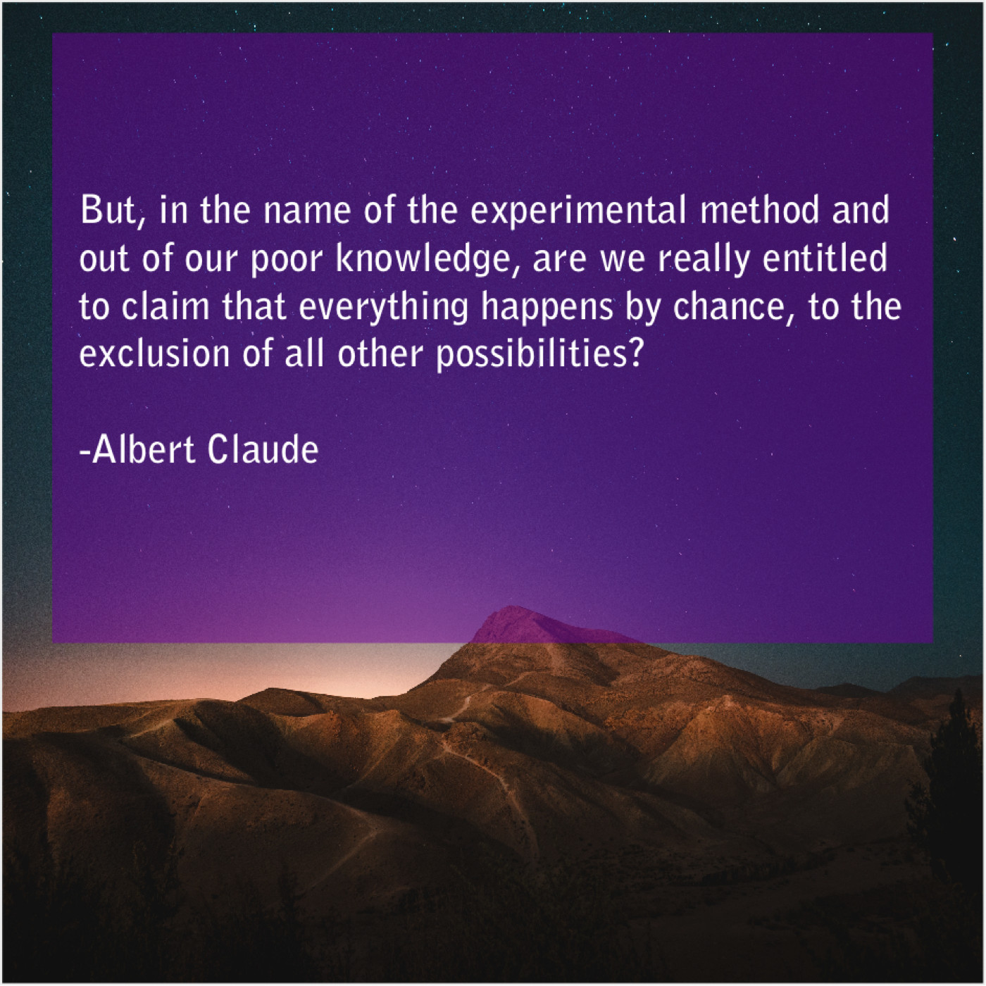 Albert Claude Albert Claude – But, in the name of… November 19, 2018 admin “But, in the name of the experimental method and out of our poor knowledge, are we really entitled to claim that everything happens by chance, to the exclusion of all other possibilities?”-Albert Claude