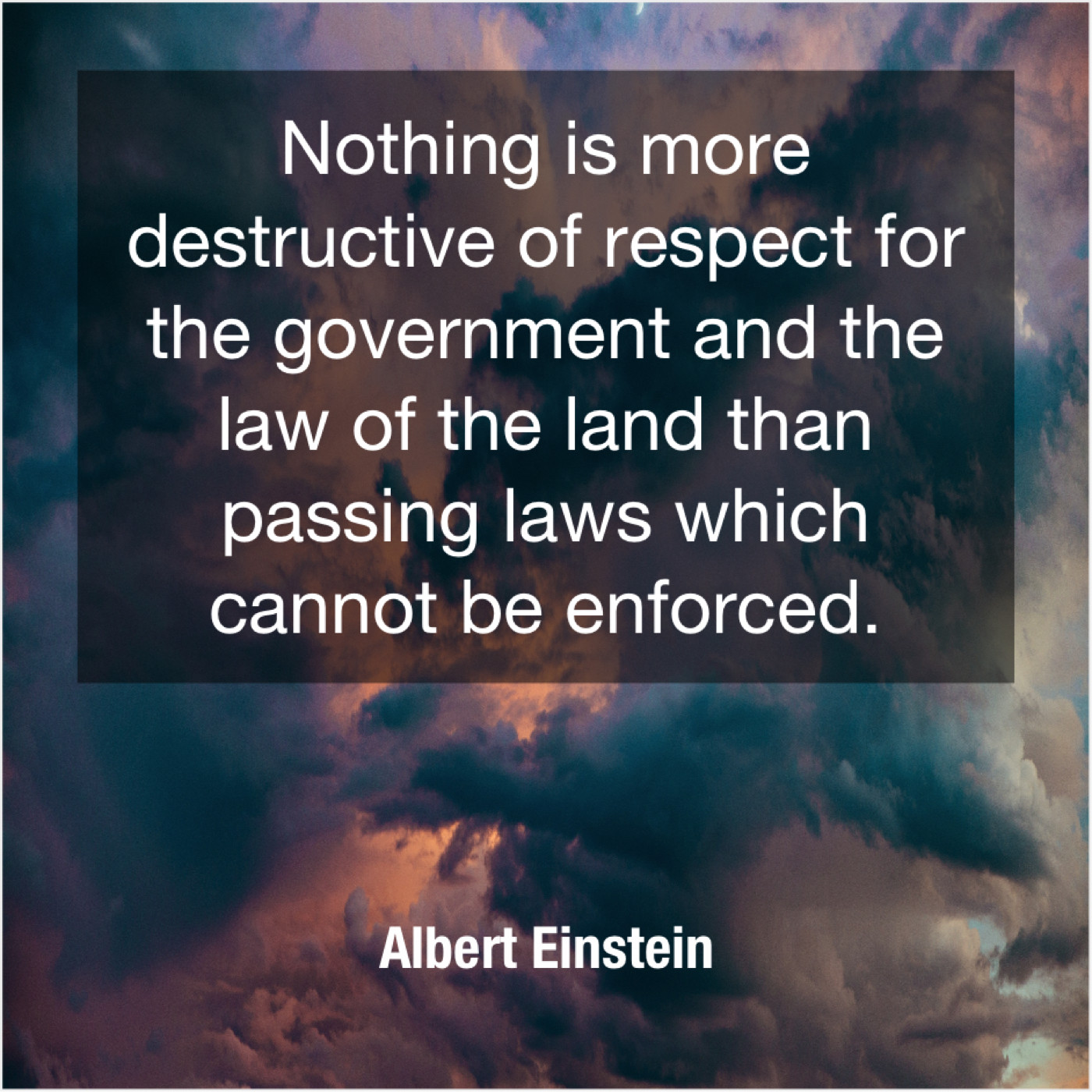 Albert Einstein Albert Einstein – Nothing is more destructive of… January 31, 2019 admin “Nothing is more destructive of respect for the government and the law of the land than passing laws which cannot be enforced.”-Albert Einstein