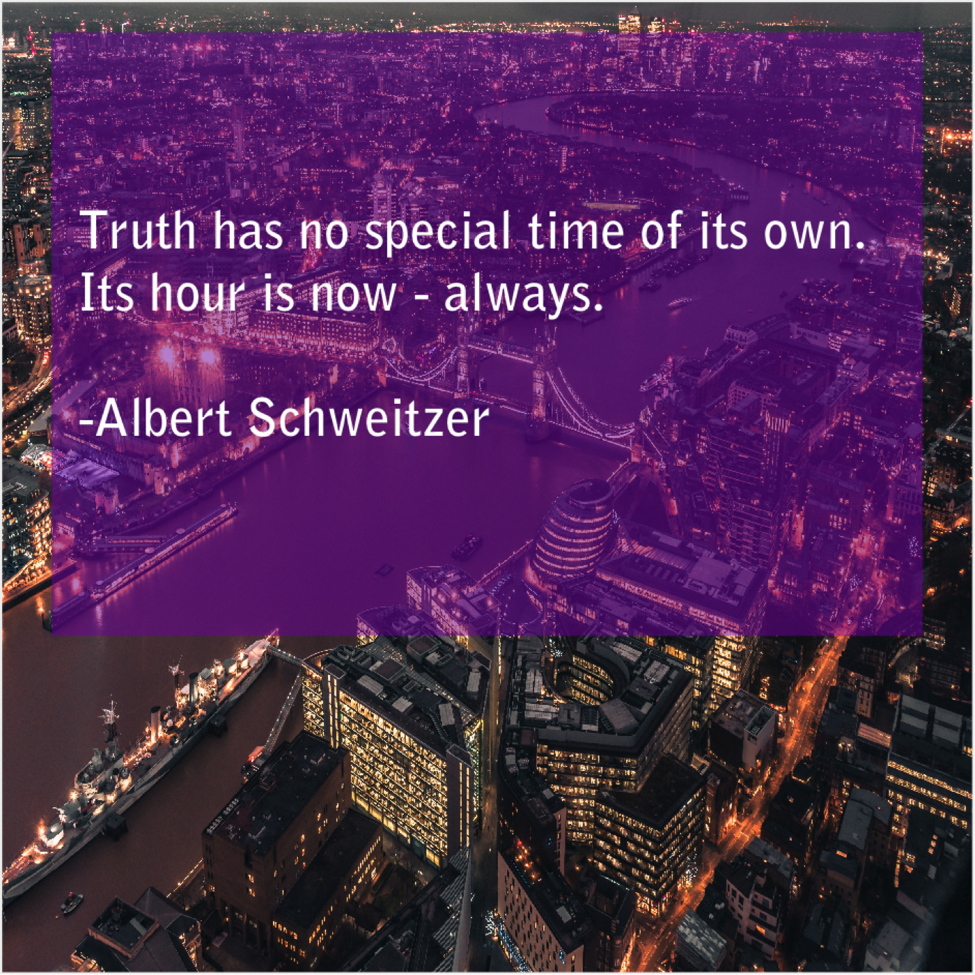 Albert Schweitzer Albert Schweitzer – Truth has no special time… August 24, 2019 admin “Truth has no special time of its own. Its hour is now – always.”-Albert Schweitzer
