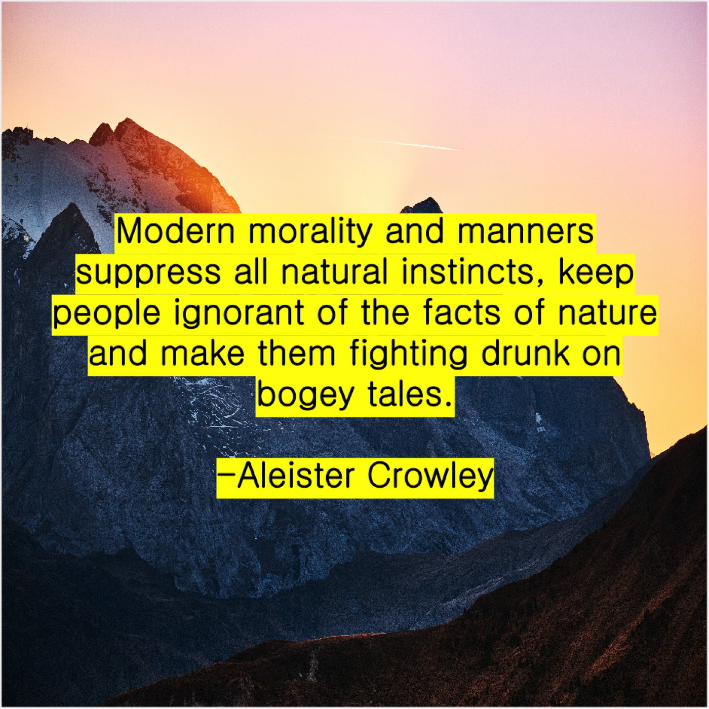 Aleister Crowley Aleister Crowley – Modern morality and manners suppress… August 8, 2019 admin “Modern morality and manners suppress all natural instincts, keep people ignorant of the facts of nature and make them fighting drunk on bogey tales.”-Aleister Crowley