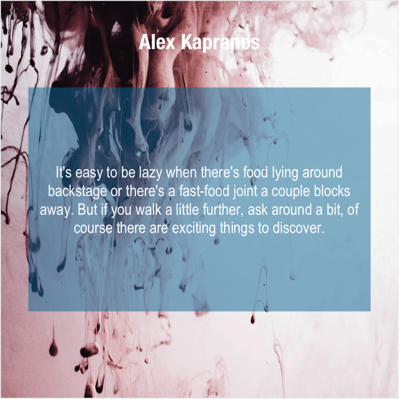 Alex Kapranos Alex Kapranos – It’s easy to be lazy… November 17, 2018 admin “It’s easy to be lazy when there’s food lying around backstage or there’s a fast-food joint a couple blocks away. But if you walk a little further, ask around a bit, of course there are exciting things to discover.”-Alex Kapranos