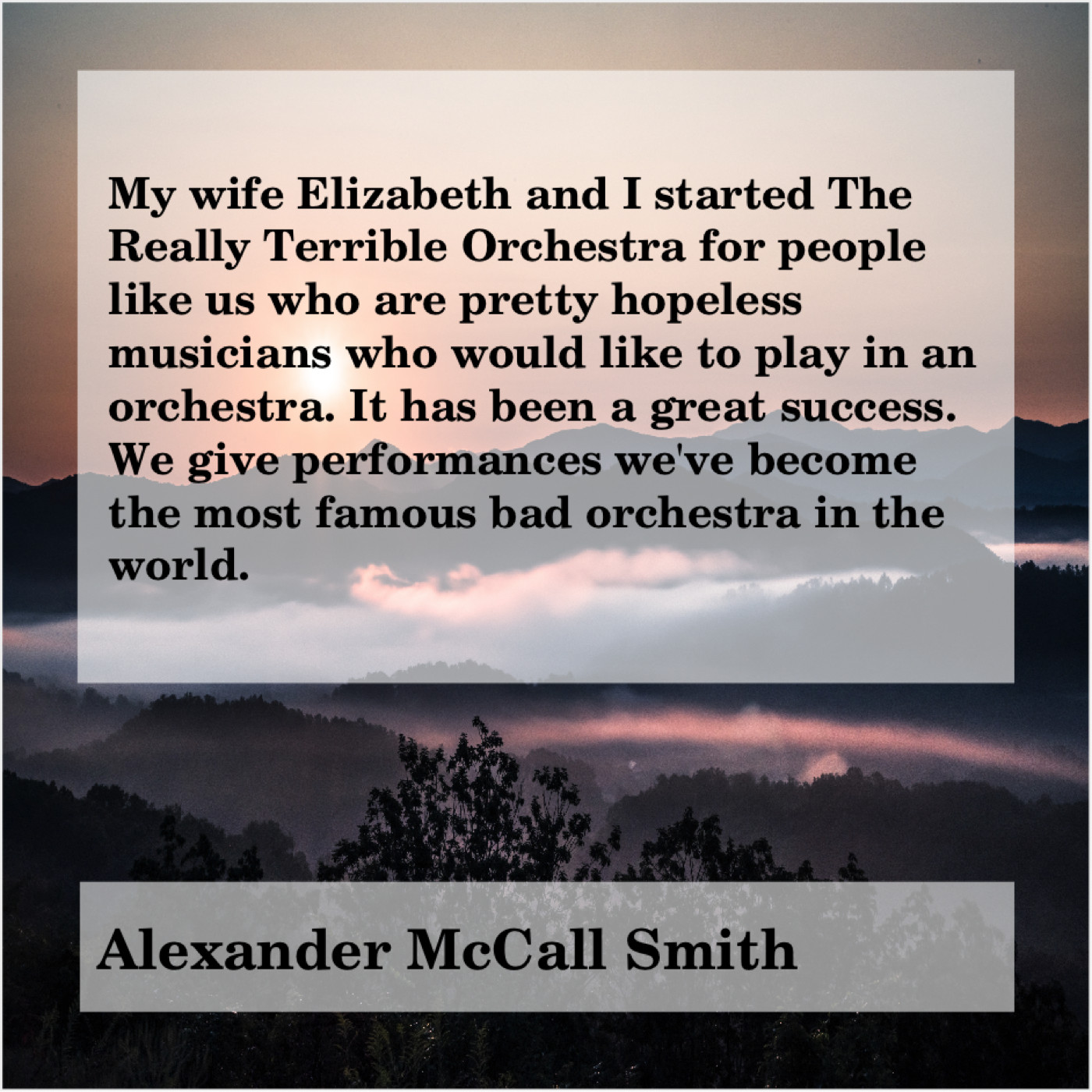 “My wife Elizabeth and I started The Really Terrible Orchestra for people like us who are pretty hopeless musicians who would like to play in an orchestra. It has been a great success. We give performances we’ve become the most famous bad orchestra in the world.”