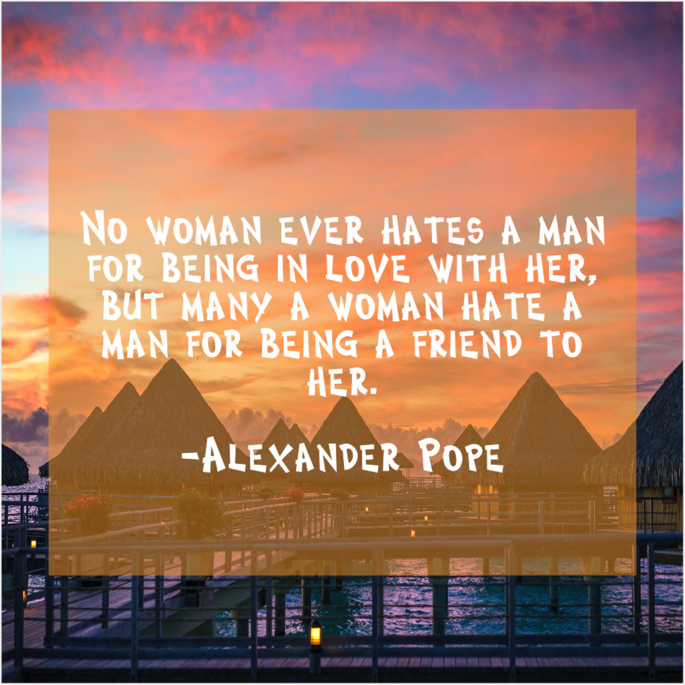 Alexander Pope Alexander Pope – No woman ever hates a… February 9, 2019 admin “No woman ever hates a man for being in love with her, but many a woman hate a man for being a friend to her.”-Alexander Pope