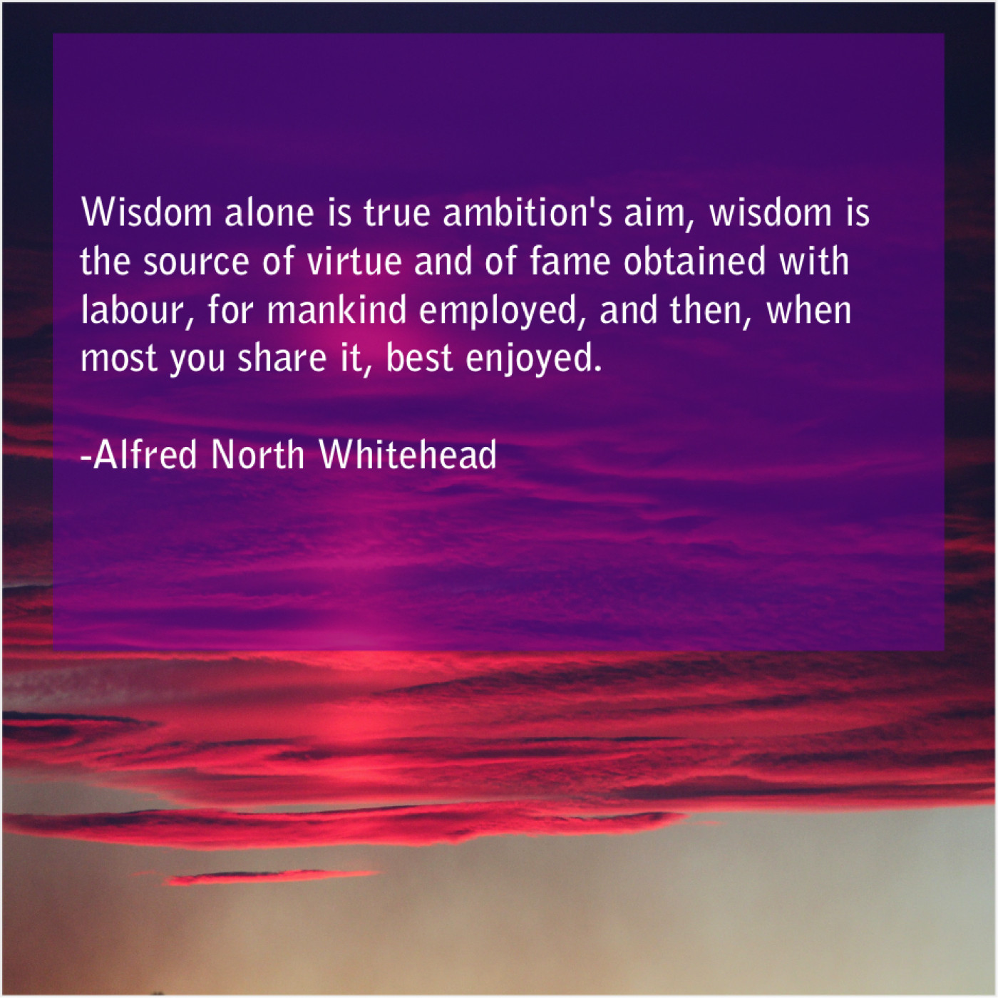 Alfred North Whitehead Alfred North Whitehead – Wisdom alone is true ambition’s… April 21, 2019 admin “Wisdom alone is true ambition’s aim, wisdom is the source of virtue and of fame obtained with labour, for mankind employed, and then, when most you share it, best enjoyed.”-Alfred North Whitehead