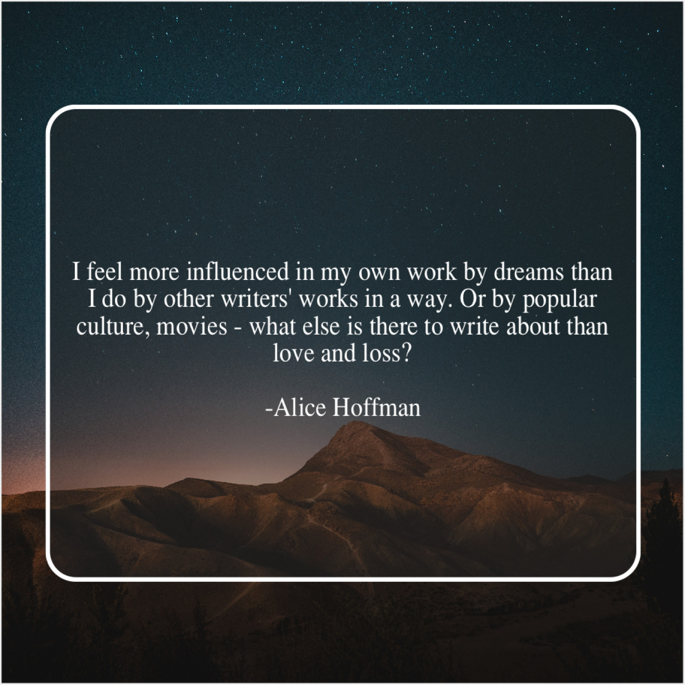 Alice Hoffman Alice Hoffman – I feel more influenced in… February 19, 2019 admin “I feel more influenced in my own work by dreams than I do by other writers’ works in a way. Or by popular culture, movies – what else is there to write about than love and loss?”-Alice Hoffman