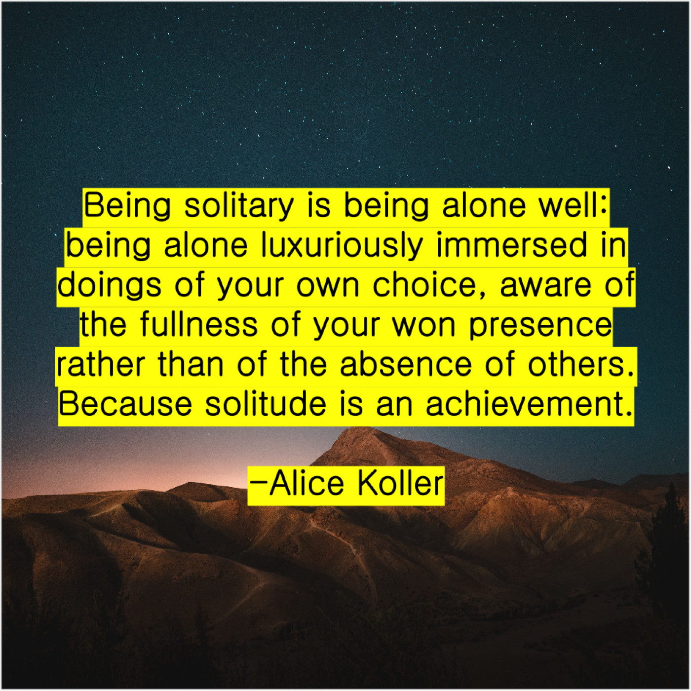 Alice Koller Alice Koller – Being solitary is being alone… May 29, 2019 admin “Being solitary is being alone well: being alone luxuriously immersed in doings of your own choice, aware of the fullness of your won presence rather than of the absence of others. Because solitude is an achievement.”-Alice Koller