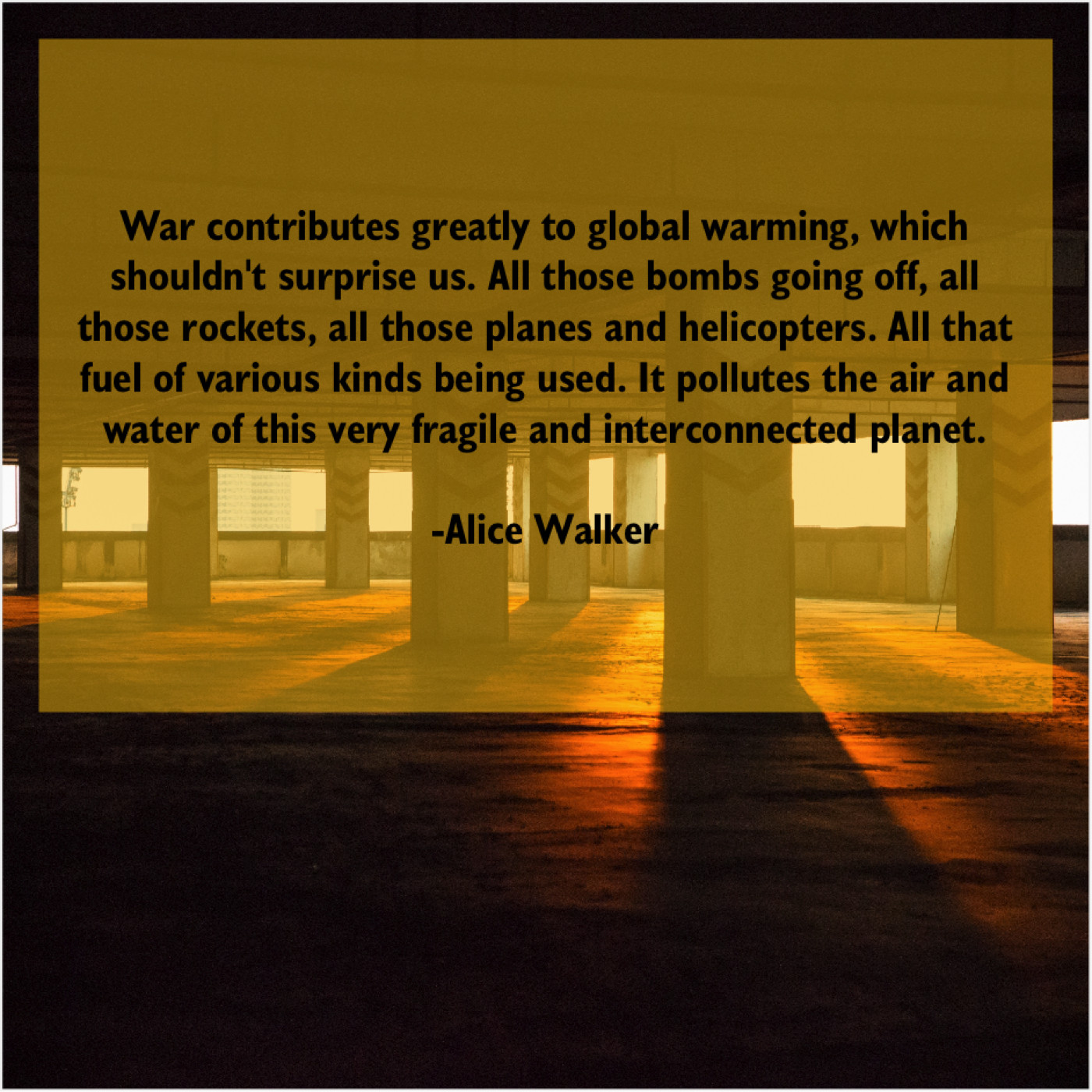 “War contributes greatly to global warming, which shouldn’t surprise us. All those bombs going off, all those rockets, all those planes and helicopters. All that fuel of various kinds being used. It pollutes the air and water of this very fragile and interconnected planet.”