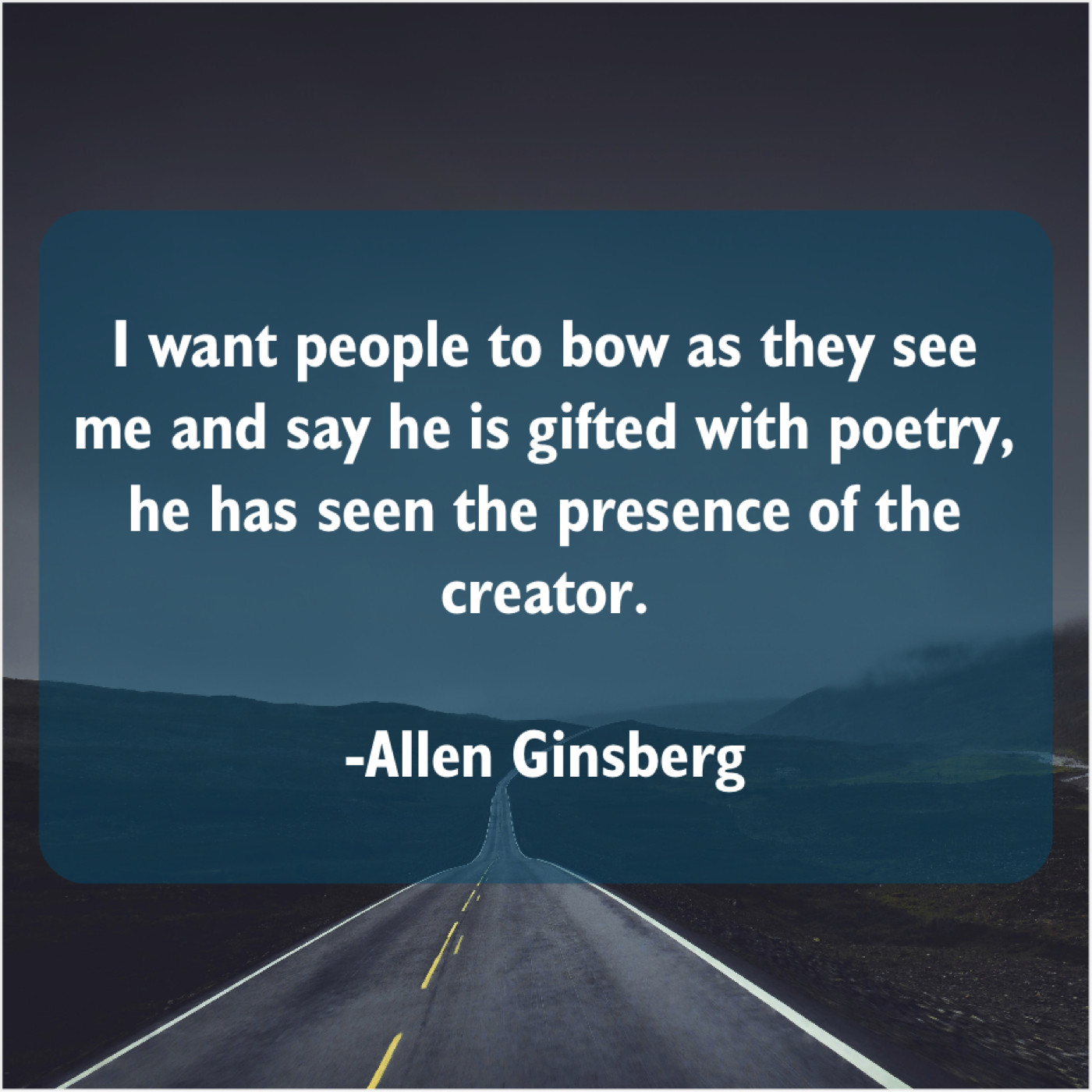 Allen Ginsberg Allen Ginsberg – I want people to bow… June 1, 2019 admin “I want people to bow as they see me and say he is gifted with poetry, he has seen the presence of the creator.”-Allen Ginsberg