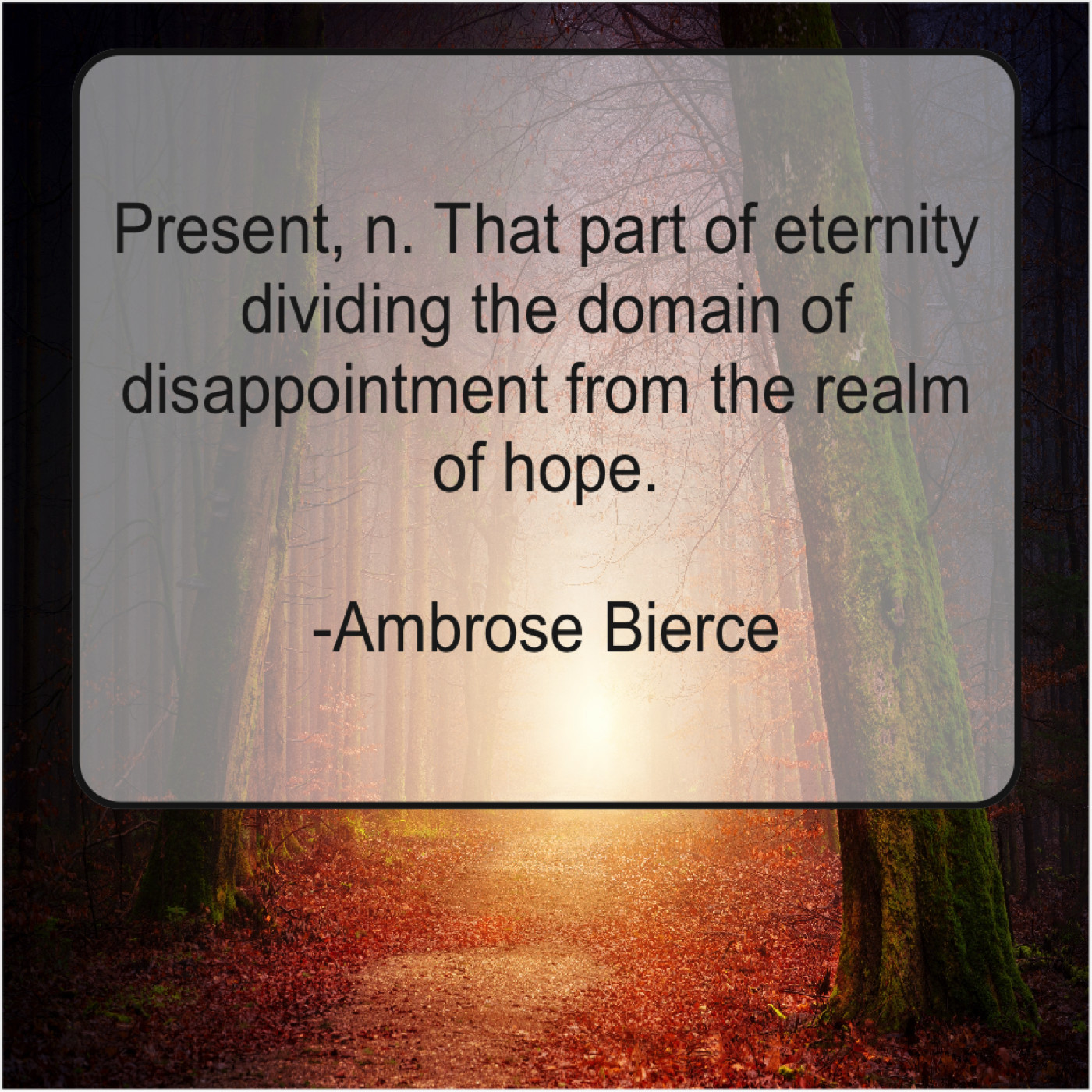 Ambrose Bierce Ambrose Bierce – Present, n. That part of… January 18, 2019 admin “Present, n. That part of eternity dividing the domain of disappointment from the realm of hope.”-Ambrose Bierce