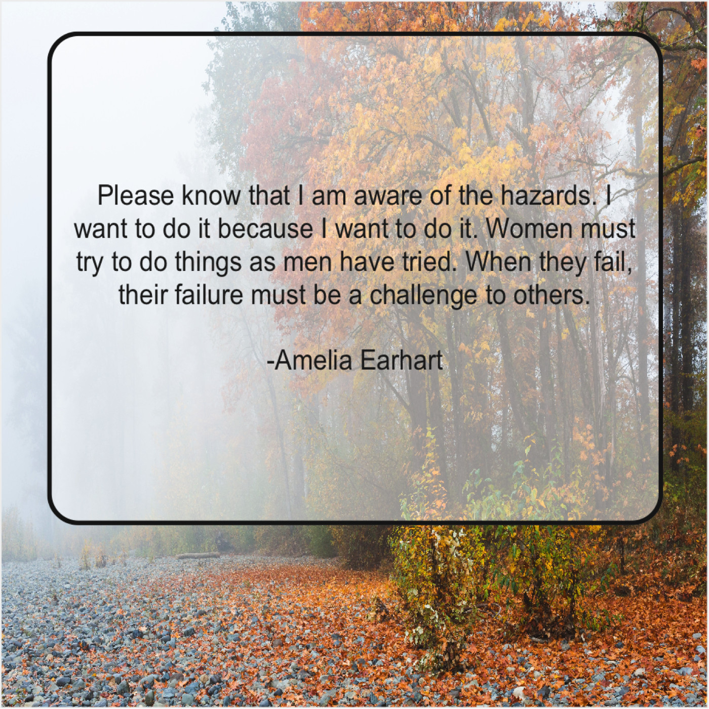 Amelia Earhart Amelia Earhart – Please know that I am… June 27, 2019 admin “Please know that I am aware of the hazards. I want to do it because I want to do it. Women must try to do things as men have tried. When they fail, their failure must be a challenge to others.”-Amelia Earhart