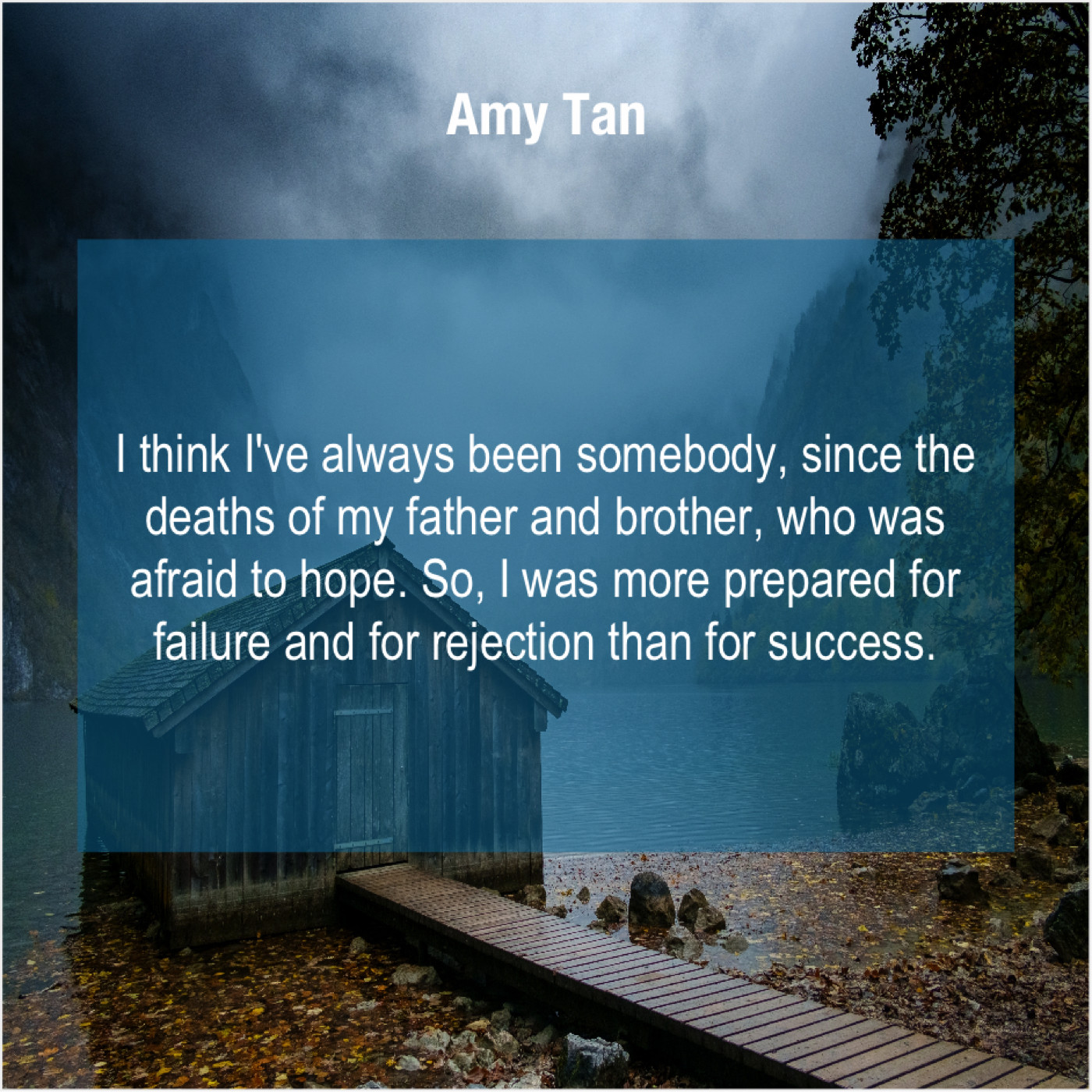 Amy Tan Amy Tan – I think I’ve always been… February 10, 2019 admin “I think I’ve always been somebody, since the deaths of my father and brother, who was afraid to hope. So, I was more prepared for failure and for rejection than for success.”-Amy Tan