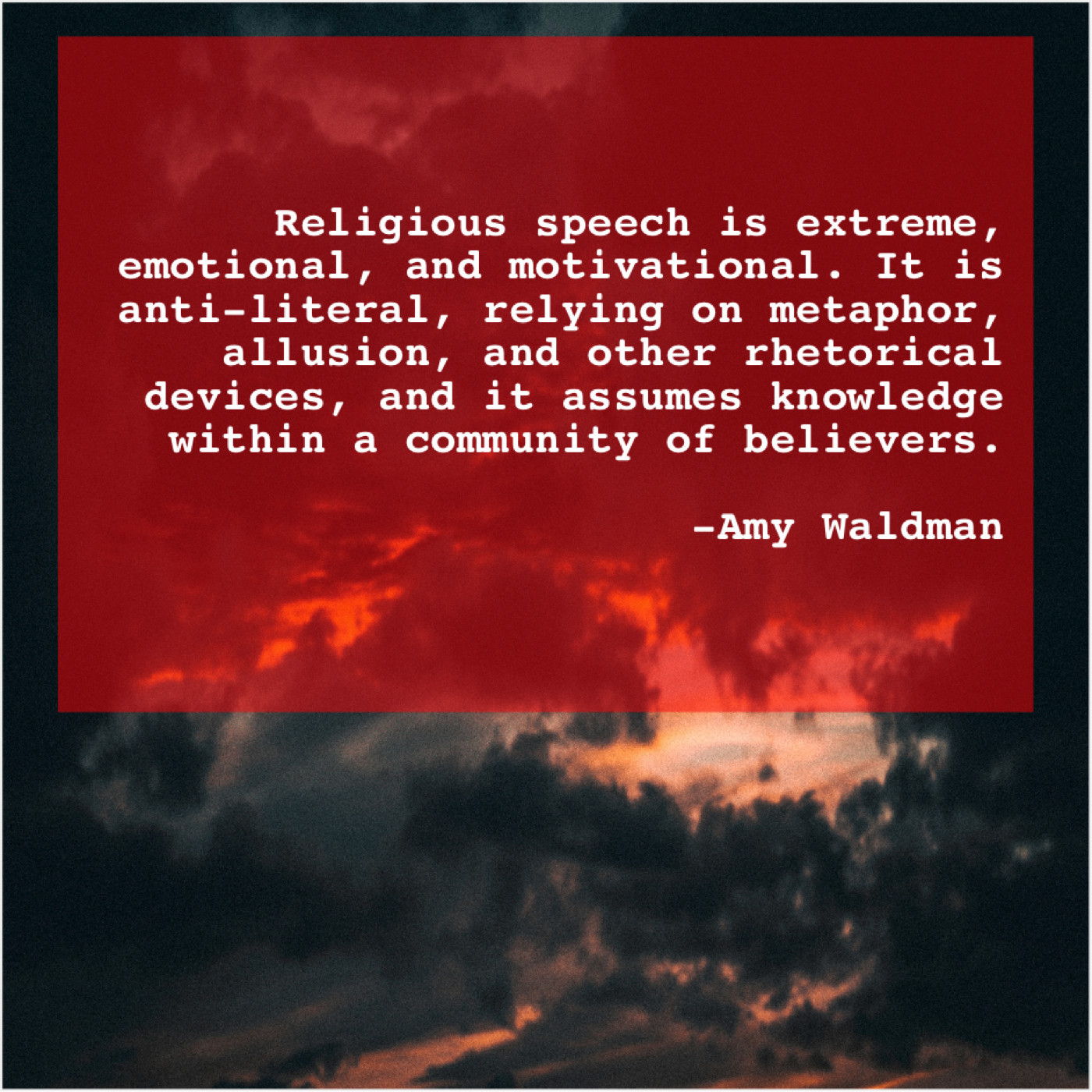Amy Waldman Amy Waldman – Religious speech is extreme, emotional… September 9, 2019 admin “Religious speech is extreme, emotional, and motivational. It is anti-literal, relying on metaphor, allusion, and other rhetorical devices, and it assumes knowledge within a community of believers.”-Amy Waldman
