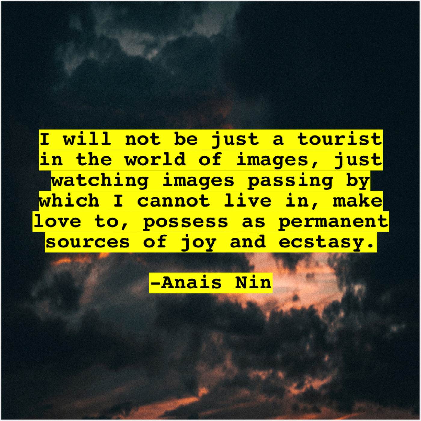 Anais Nin Anais Nin – I will not be just… November 27, 2018 admin “I will not be just a tourist in the world of images, just watching images passing by which I cannot live in, make love to, possess as permanent sources of joy and ecstasy.”-Anais Nin