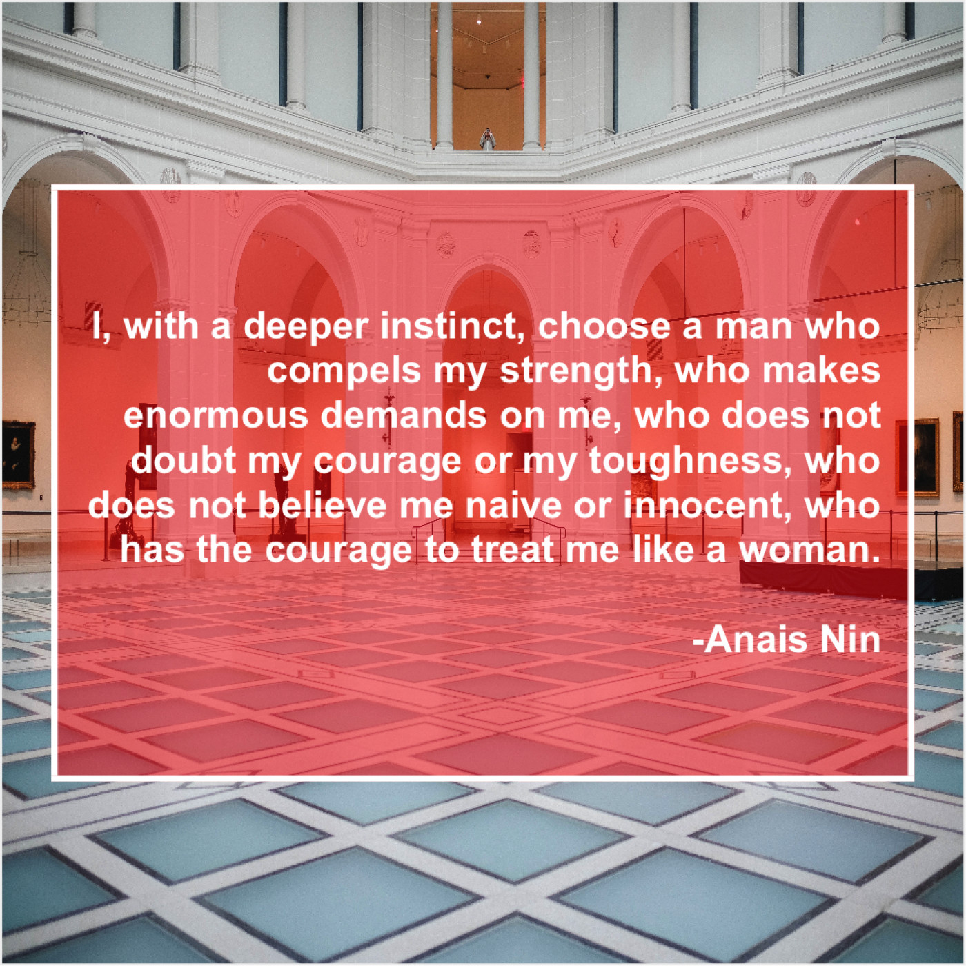 Anais Nin Anais Nin – I, with a deeper instinct… April 20, 2019 admin “I, with a deeper instinct, choose a man who compels my strength, who makes enormous demands on me, who does not doubt my courage or my toughness, who does not believe me naive or innocent, who has the courage to treat me like a woman.”-Anais Nin
