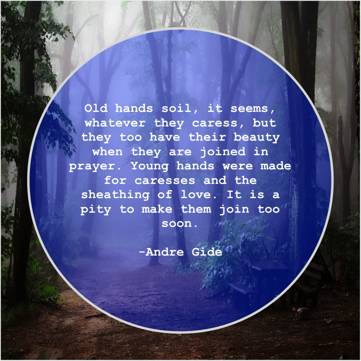Andre Gide Andre Gide – Old hands soil, it seems… March 5, 2019 admin “Old hands soil, it seems, whatever they caress, but they too have their beauty when they are joined in prayer. Young hands were made for caresses and the sheathing of love. It is a pity to make them join too soon.”-Andre Gide