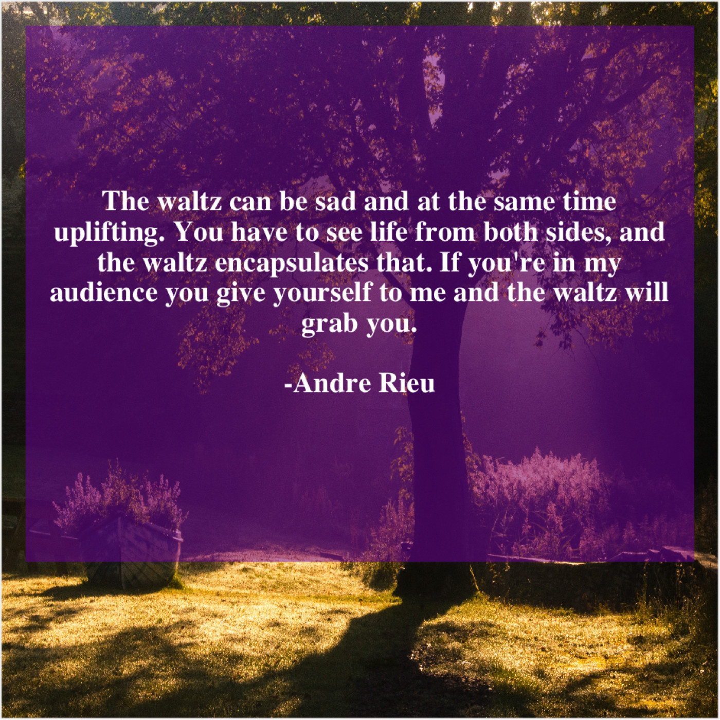 Andre Rieu Andre Rieu – The waltz can be sad… July 21, 2019 admin “The waltz can be sad and at the same time uplifting. You have to see life from both sides, and the waltz encapsulates that. If you’re in my audience you give yourself to me and the waltz will grab you.”-Andre Rieu