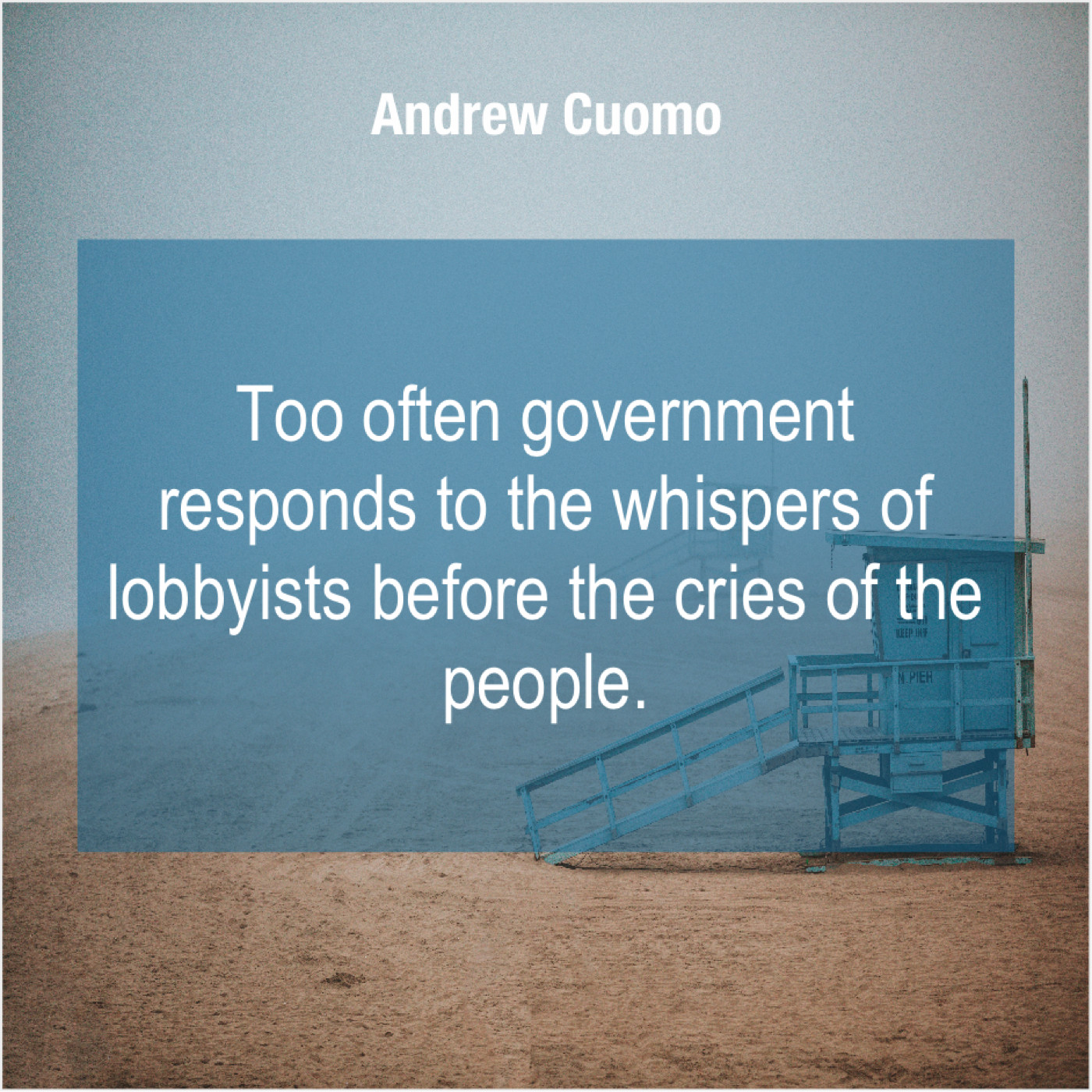Andrew Cuomo Andrew Cuomo – Too often government responds to… March 20, 2019 admin “Too often government responds to the whispers of lobbyists before the cries of the people.”-Andrew Cuomo