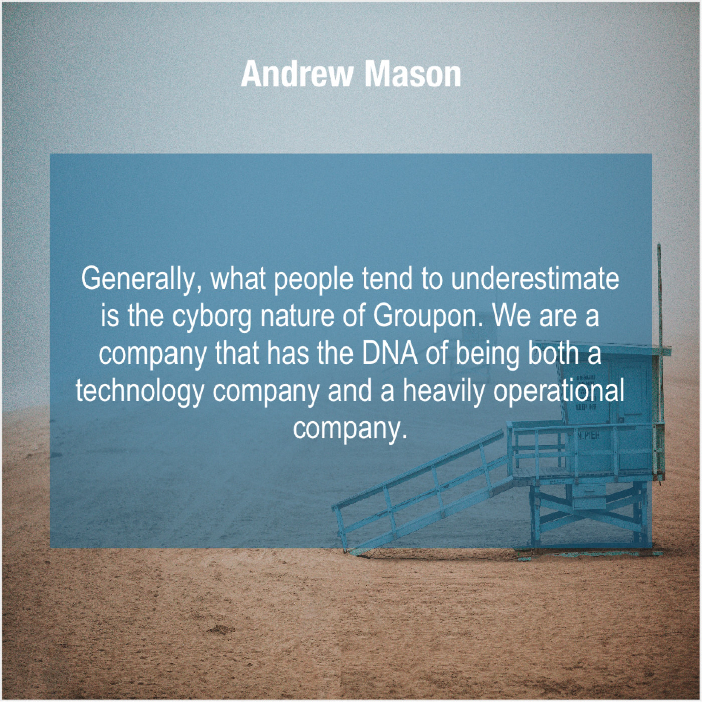 Andrew Mason Andrew Mason – Generally, what people tend to… August 19, 2019 admin “Generally, what people tend to underestimate is the cyborg nature of Groupon. We are a company that has the DNA of being both a technology company and a heavily operational company.”-Andrew Mason