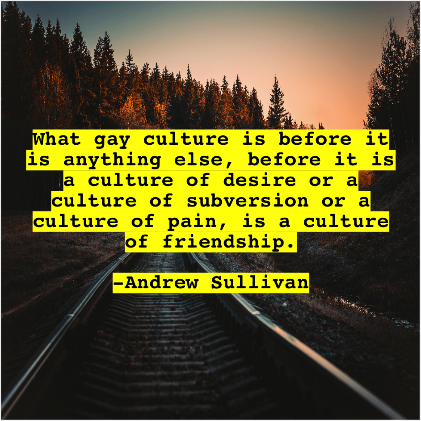 Andrew Sullivan Andrew Sullivan – What gay culture is before… April 14, 2019 admin “What gay culture is before it is anything else, before it is a culture of desire or a culture of subversion or a culture of pain, is a culture of friendship.”-Andrew Sullivan