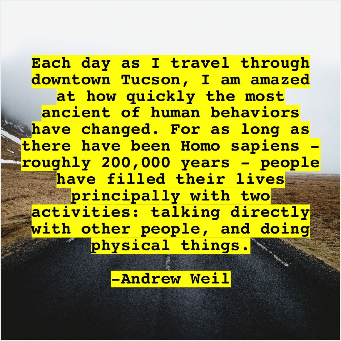 “Each day as I travel through downtown Tucson, I am amazed at how quickly the most ancient of human behaviors have changed. For as long as there have been Homo sapiens – roughly 200,000 years – people have filled their lives principally with two activities: talking directly with other people, and doing physical things.”
