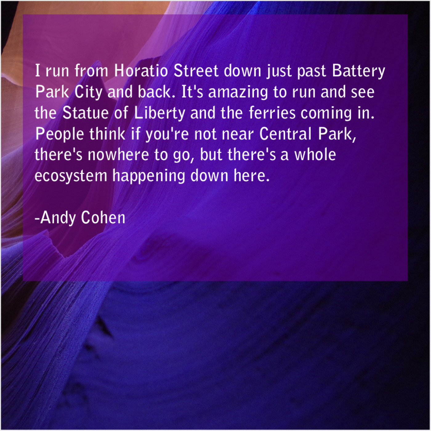 “I run from Horatio Street down just past Battery Park City and back. It’s amazing to run and see the Statue of Liberty and the ferries coming in. People think if you’re not near Central Park, there’s nowhere to go, but there’s a whole ecosystem happening down here.”