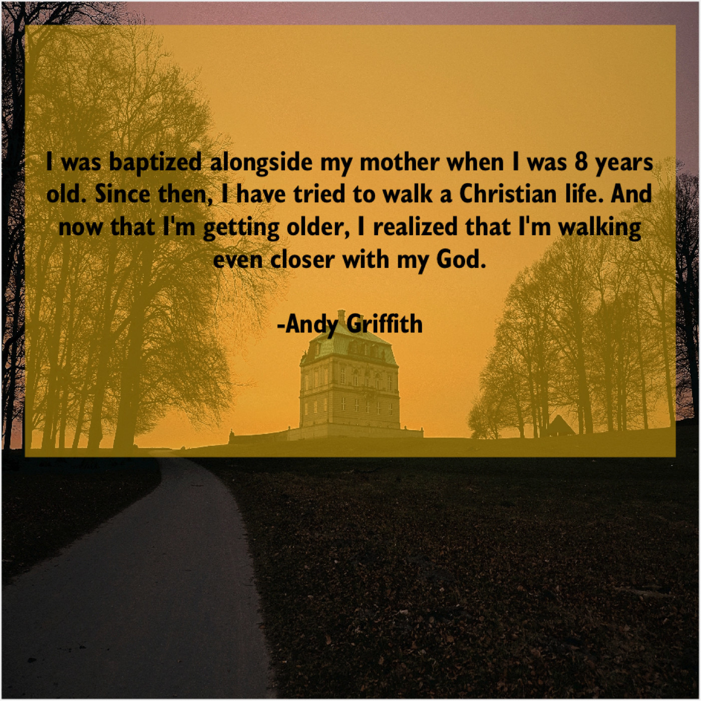 Andy Griffith Andy Griffith – I was baptized alongside my… November 14, 2018 admin “I was baptized alongside my mother when I was 8 years old. Since then, I have tried to walk a Christian life. And now that I’m getting older, I realized that I’m walking even closer with my God.”-Andy Griffith