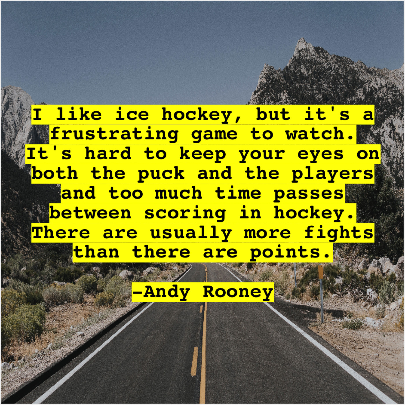 Andy Rooney Andy Rooney – I like ice hockey, but… February 15, 2019 admin “I like ice hockey, but it’s a frustrating game to watch. It’s hard to keep your eyes on both the puck and the players and too much time passes between scoring in hockey. There are usually more fights than there are points.”-Andy Rooney