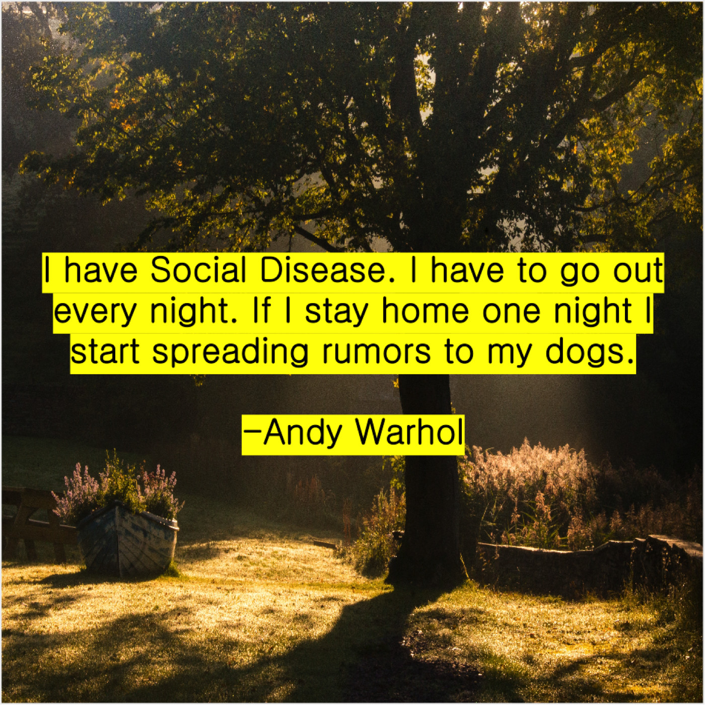 Andy Warhol Andy Warhol – I have Social Disease. I… July 14, 2019 admin “I have Social Disease. I have to go out every night. If I stay home one night I start spreading rumors to my dogs.”-Andy Warhol